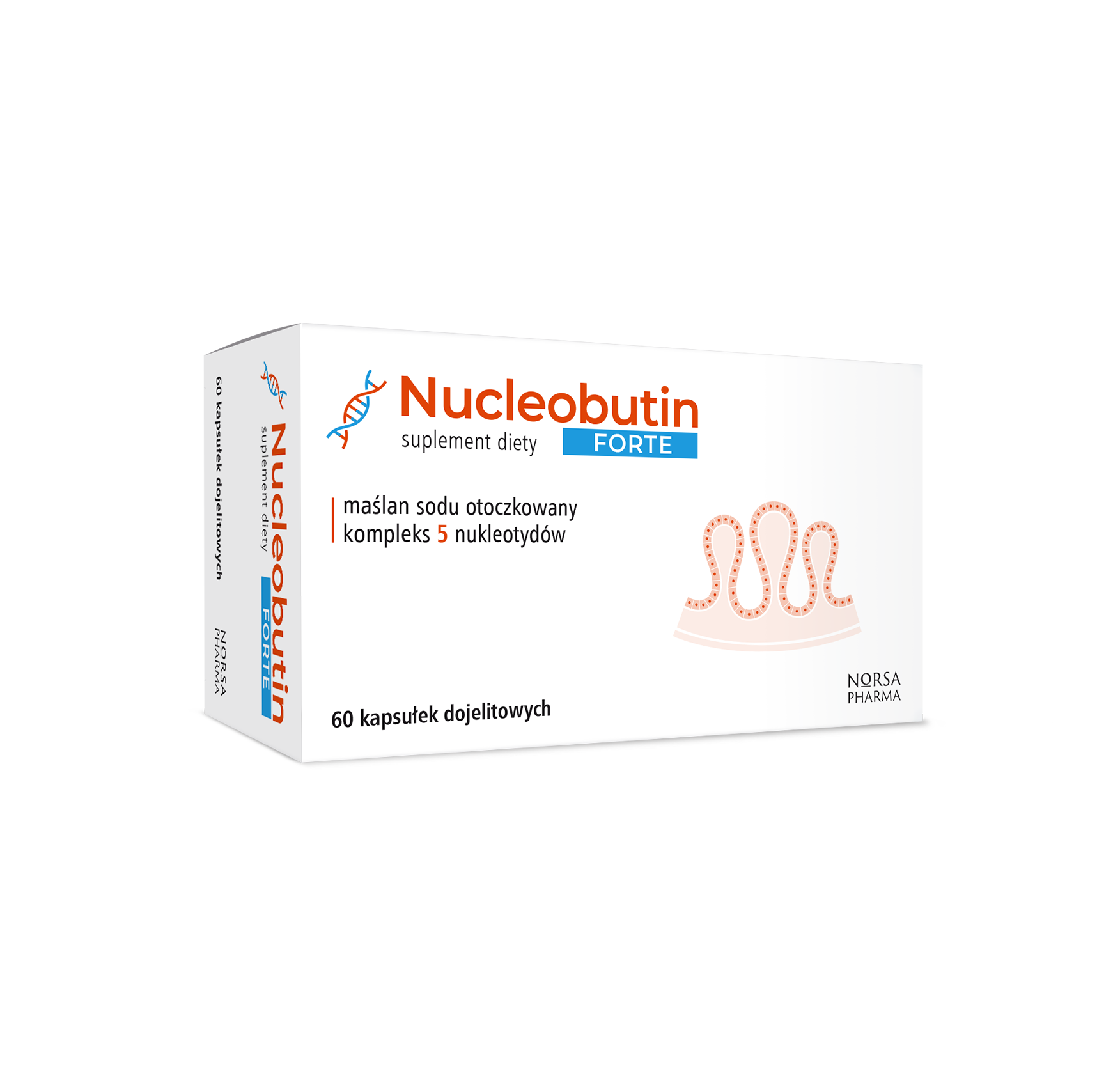 W suplementacji dietetycznej, kwas masłowy ze względu na niską trwałość i bardzo nieprzyjemny zapach, wykorzystywany jest w formie soli – najczęściej pod postacią maślanu sodu. W Nucleobutin Forte wykorzystano starannie dobrany maślan sodu otoczkowany w skrobię preżelowaną, dzięki czemu jest on wolny od oleju palmowego. Zastosowane w produkcie kapsułki dojelitowe są odporne na kwaśne środowisko żołądka i chronią zawartość przed strawieniem w górnych częściach przewodu pokarmowego.