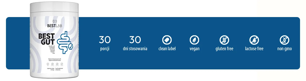 W składzie BestGut znajdziesz wysokiej jakości prebiotyki (błonnik akacjowy i PHGG), aminokwas L-glutaminę oraz roślinne ekstrakty standaryzowane na substancje aktywne, które wspierają regenerację nabłonka jelit, poprawiają komfort trawienny i wspomagają odporność.