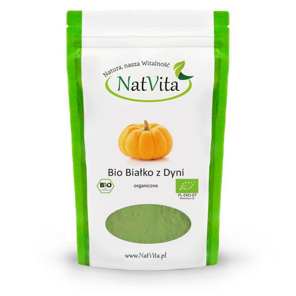 Białko z dyni (60 % białka) to produkt wysokobiałkowy w formie proszku, który dodatkowo zachowuje wszelkie właściwości dyni.