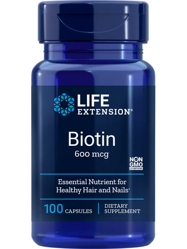 Suplement diety zawierający 600 mcg biotyny w jednej kapsułce.