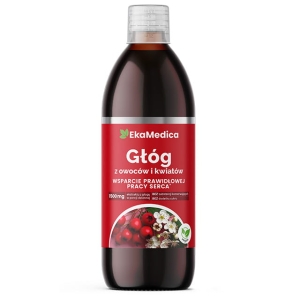 Głóg z owoców i kwiatów – suplement diety w formie płynnej, wyprodukowany z ekstraktu z owoców i kwiatów głogu. Pasteryzowany.