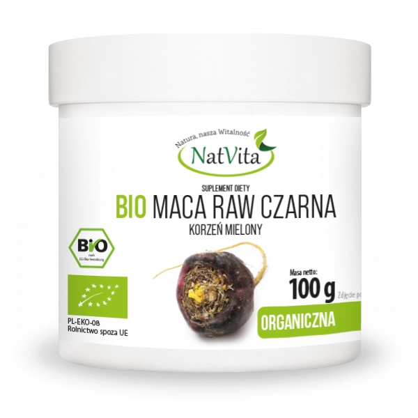 Składniki: 100 % Bio maca (Lepidium meyenii) RAW (surowa) czarna, korzeń mielony.
