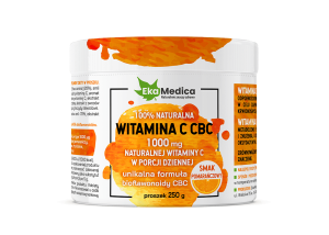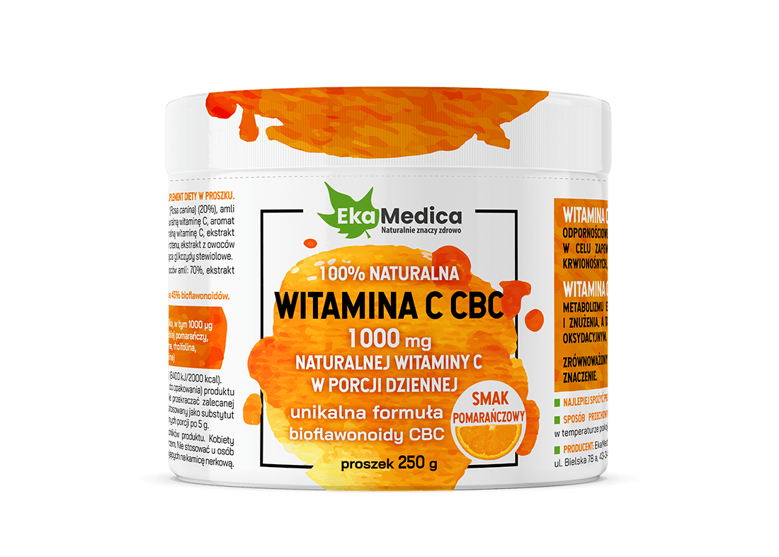 Naturalna Witamina C CBC od EkaMedica z kompleksem CBC jest o smaku pomarańczowym. Dodatkowo w opakowaniu znajduje się miarka, w postaci łyżeczki ułatwiająca precyzyjne dozowanie produktu.