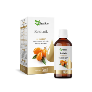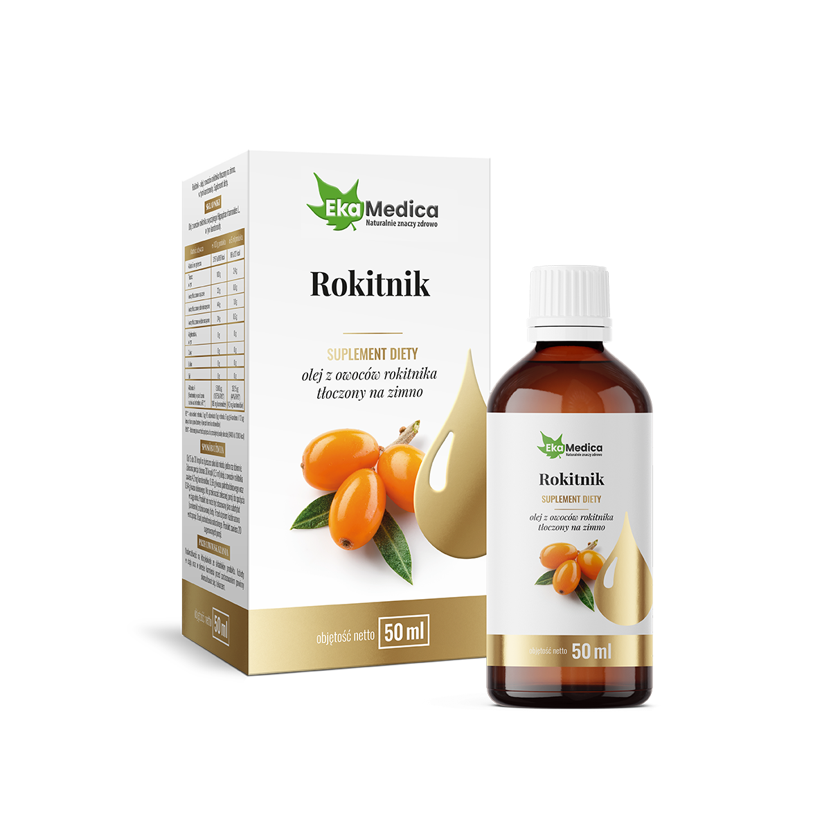 Rokitnik – olej z owoców rokitnika tłoczony na zimno, w tym karotenoidy. Suplement diety.