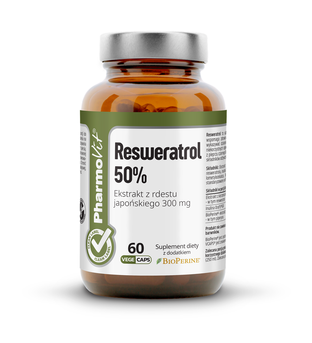 Składniki: Ekstrakt z korzenia rdestu japońskiego standaryzowany na 50% resweratrolu, inulina Orafti®GR, kapsułka celulozowa: hydroksypropylometyloceluloza, BioPerine®- ekstrakt z owoców pieprzu czarnego standaryzowany na 95% piperyny.