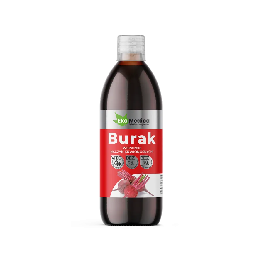 Eka Burak EkaMedica– suplement diety w formie płynnej, wyprodukowany z soku 100% z bulw buraków ćwikłowych dodatkiem witaminy C naturalnego pochodzenia. Pasteryzowany.
