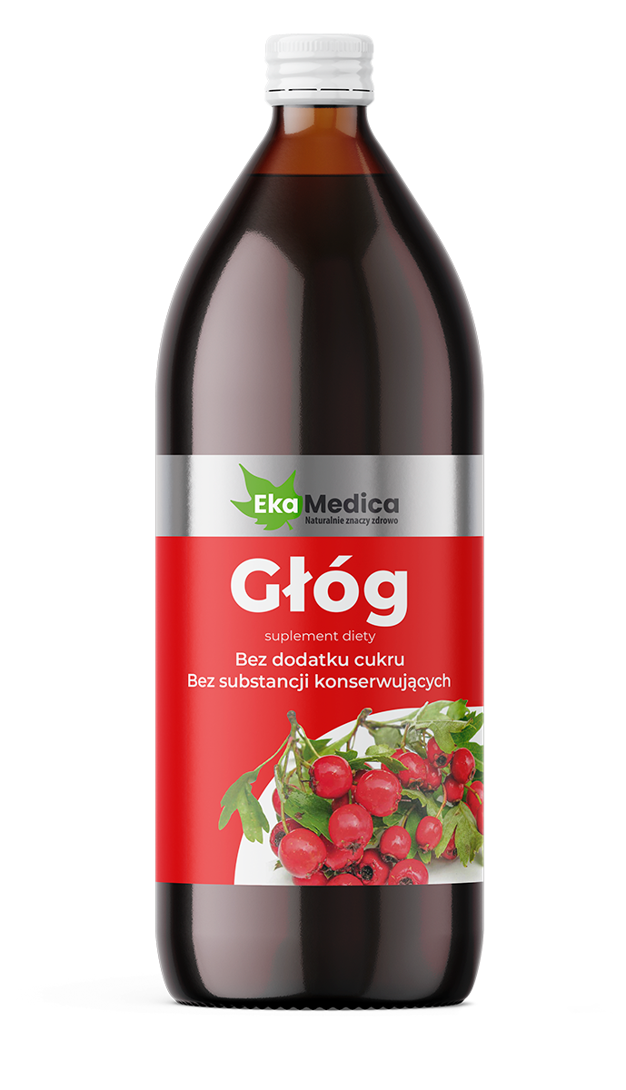 Głóg - suplement diety w formie płynnej, wyprodukowany z soku 100% z owoców głogu z dodatkiem naturalnej witaminy C pochodzącej z ekstraktu z owoców camu camu.