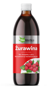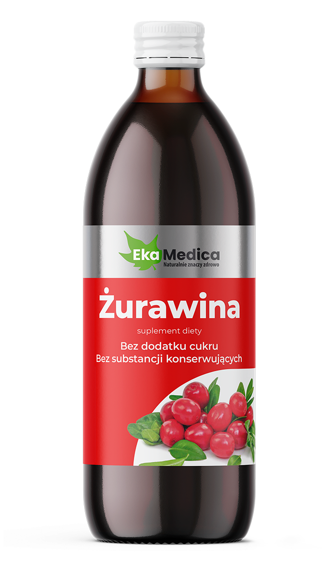 Żurawina EkaMedica – suplement diety w formie płynnej, wyprodukowany z soku 100% z owoców żurawiny wielkoowocowej z dodatkiem witaminy C naturalnego pochodzenia.
