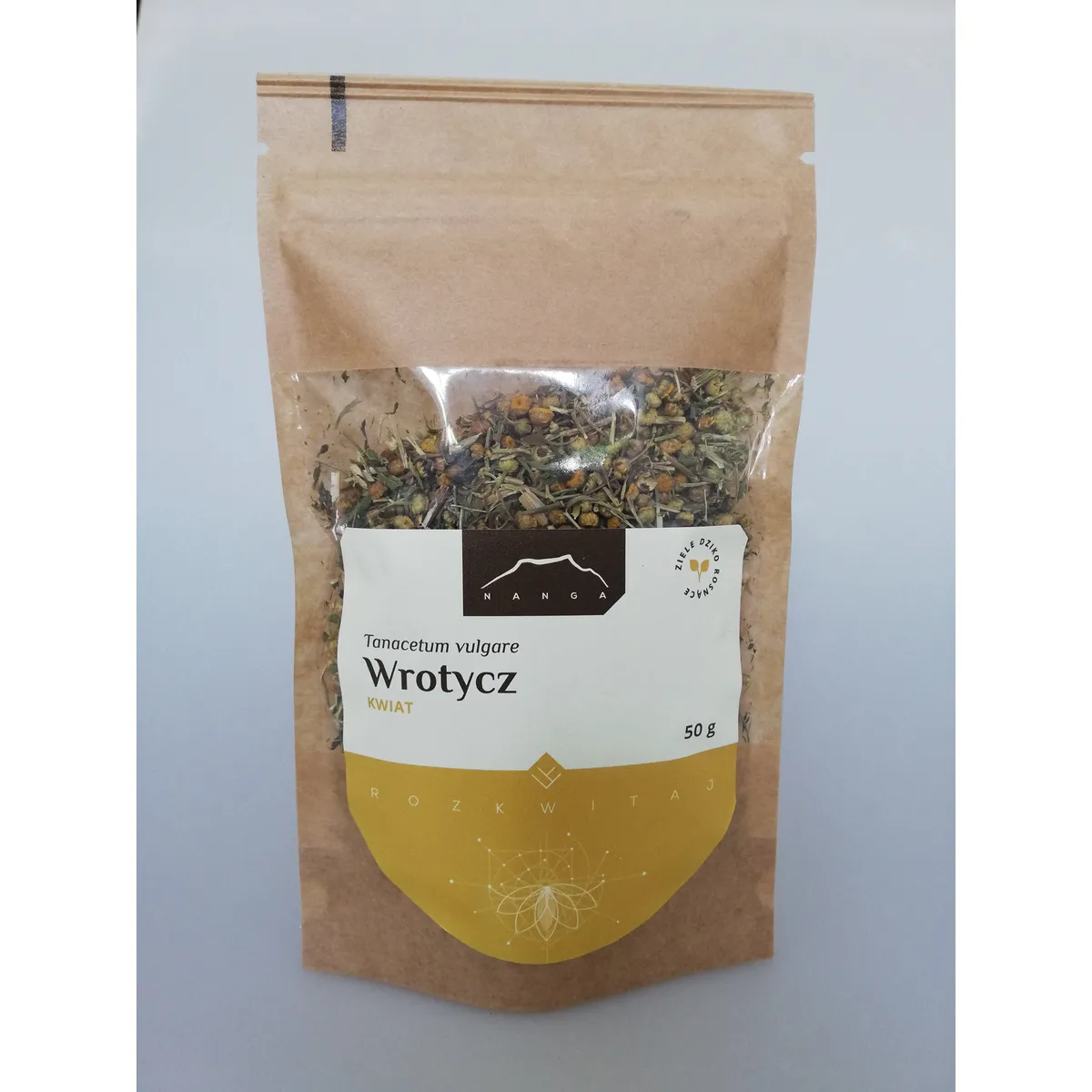 Wrotycz pospolity (Tanacetum vulgare) - silnie aromatyczna bylina należąca do rodziny astrowatych, posiadająca ciemnożółte kwiaty, osiągająca ponad metr wysokości. Występuje w całej Europie oraz na terenach klimatu umiarkowanego Azji. Surowcem zielarskim są nadziemne części rośliny. Wrotycz zawiera w sobie wiele związków aktywnych, które wykazują działanie niszczące wobec bakterii, wirusów, pasożytów i grzybów. Tanacetum vulgare posiada długą historię zastosowania. Dawniej wykorzystywano go do zwalczania pasożytów i przy zatruciach pokarmowych, a także polecano go osobom w stanach niepokoju. Kwiatami nacierano również bolące stawy i naciągnięte ścięgna, wierząc, że przyniesie to ukojenie. Wrotycz dzięki swojemu intensywnemu zapachowi znajduje dodatkowe zastosowanie jako naturalny preparat do odstraszania owadów.